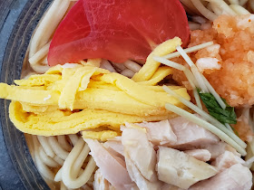具材は、トマト、鶏肉チャーシュー、大根、錦糸卵、水菜、です。鶏肉チャーシューの食感がもちもちして面白いです。