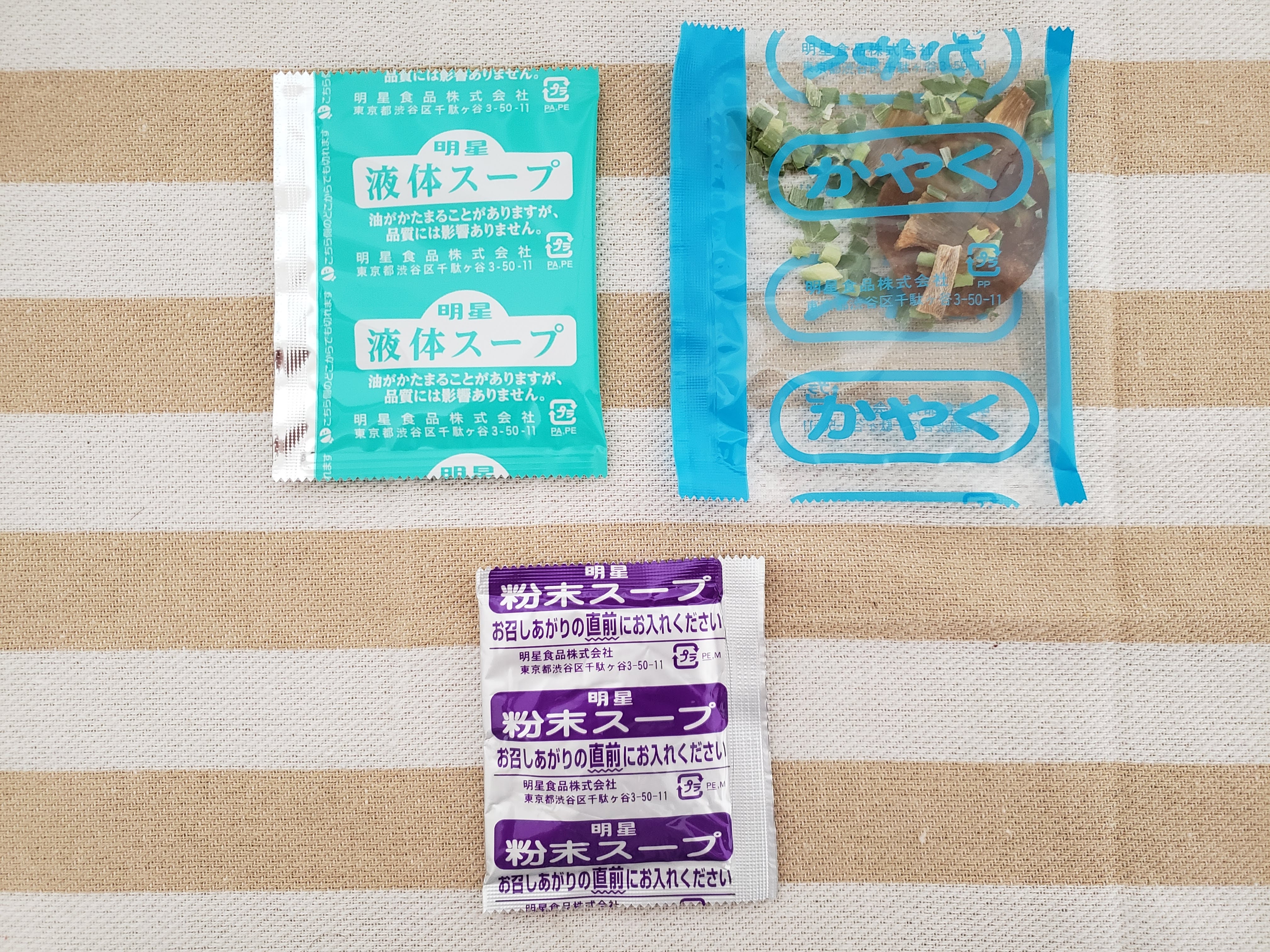 乾燥具材は、チャーシュー、メンマ、ねぎ、です。ありきたりな丸い叉焼とメンマとネギという構成で、この辺もう少し工夫が欲しいです
