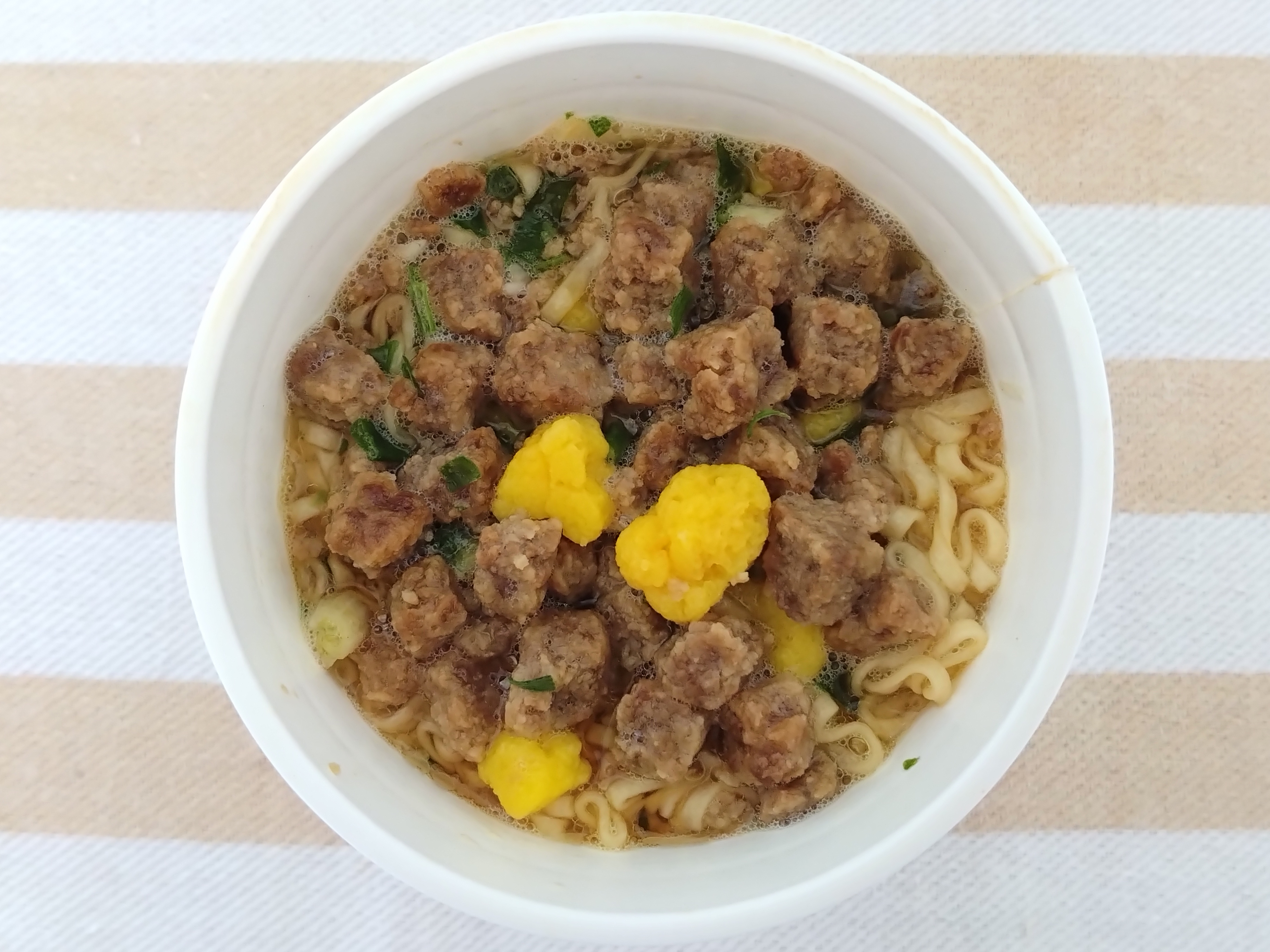 乾燥具材は、味付豚ミンチ、味付卵、ねぎ、です。勿論謎肉が中心で表面を埋め尽くすほどの量は最後の一粒を食べ終わった時の満足感が語り尽くしております。